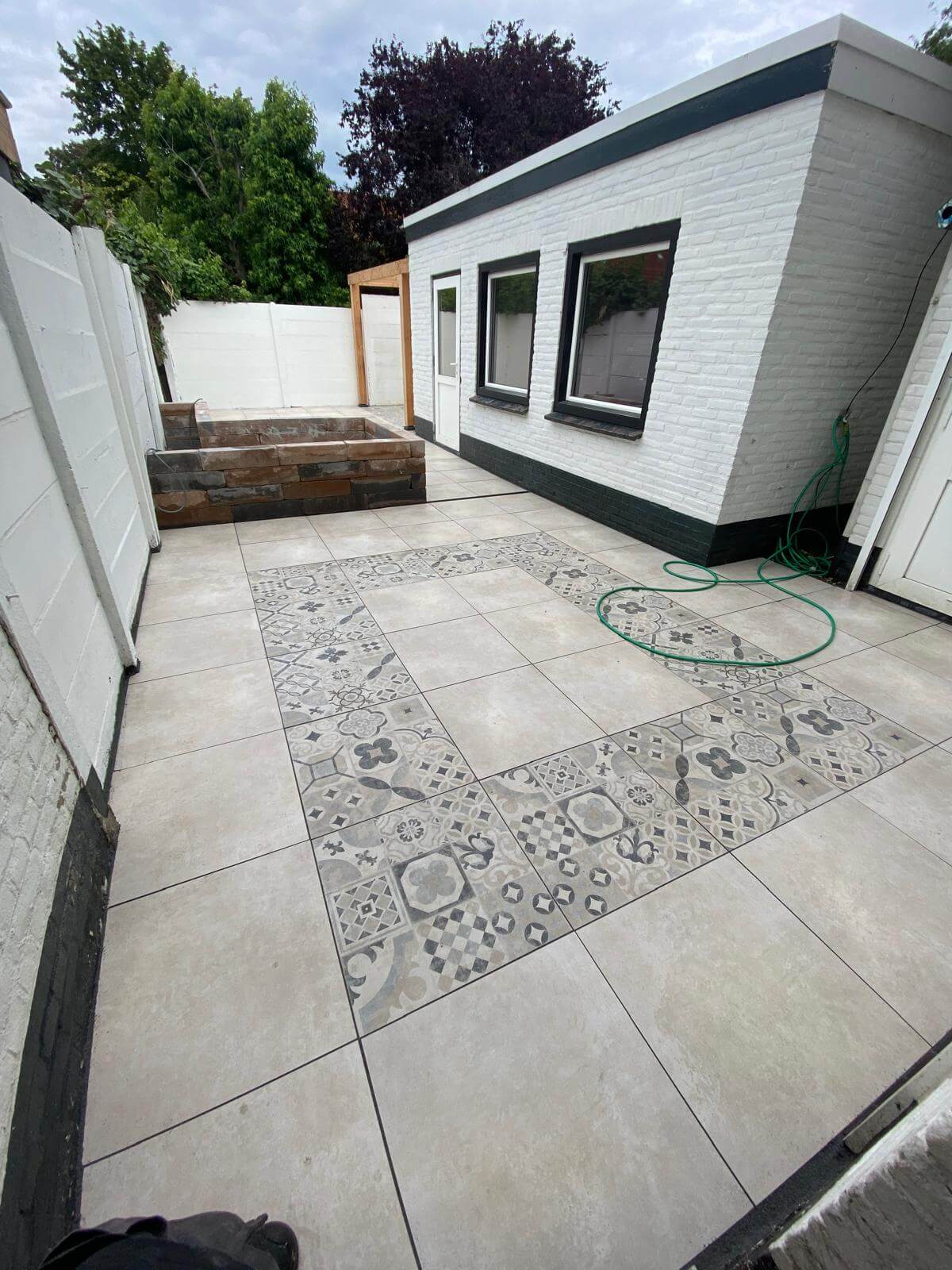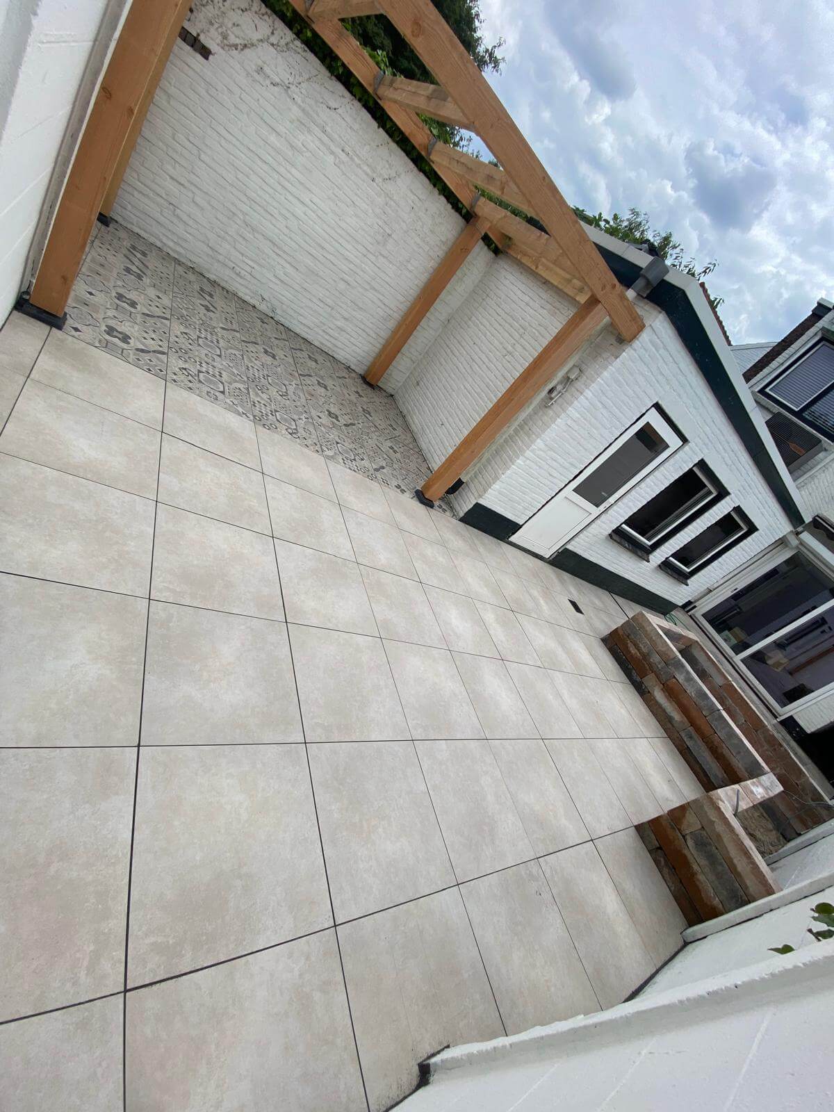 We hebben de volledige tuin opnieuw bestraat met grote keramische tegels, voorzien van een decoratieve rand met motieftegels voor extra karakter. Het hoogteverschil is opgevangen met een robuuste traptrede van natuursteen. Achterin plaatsten we een houten pergola, als basis voor een gezellige zitplek. Alle bestrating werd strak ingemeten en vakkundig verwerkt.